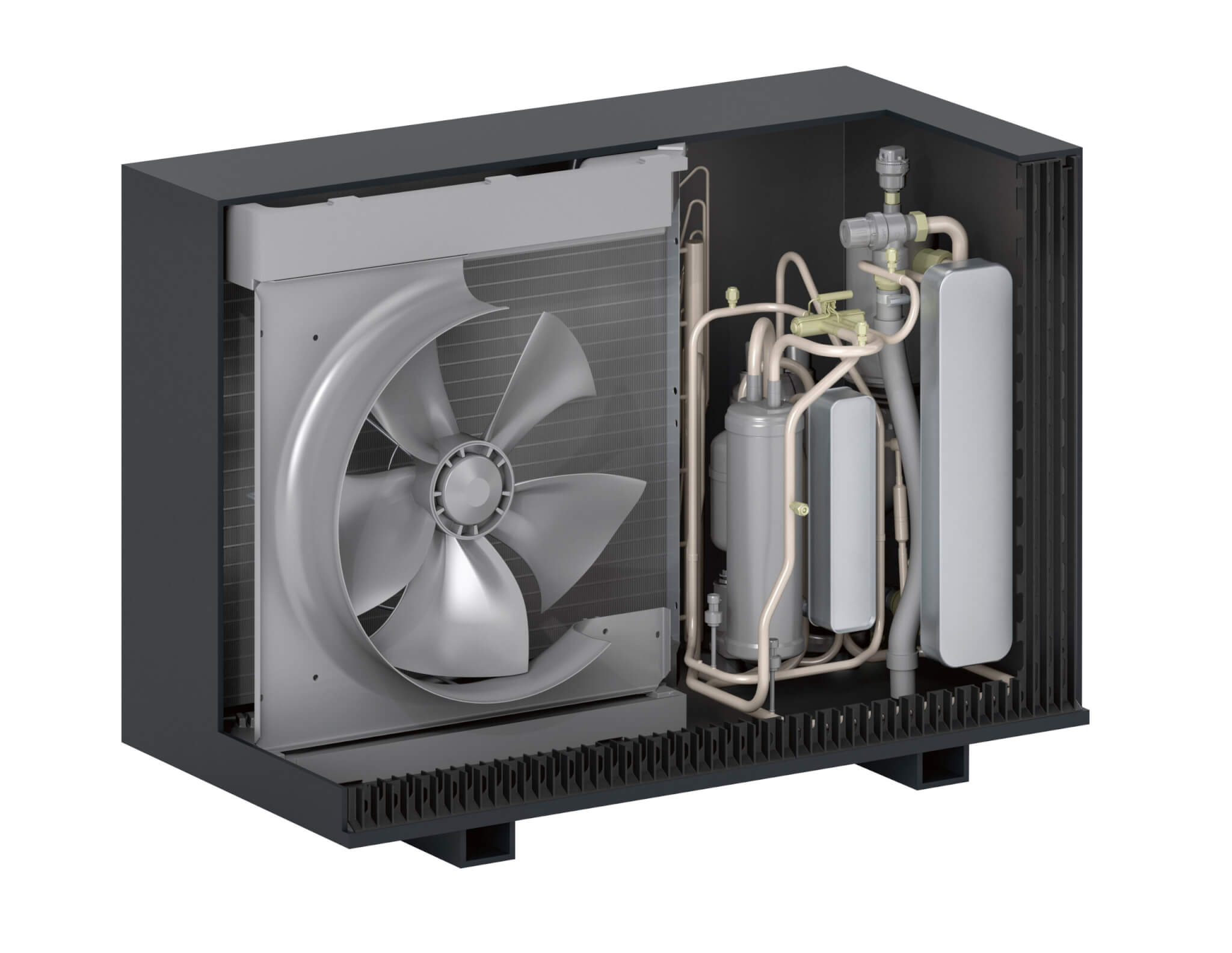 Nowa konstrukcja hydrauliczna zintegrowanej jednostki wewnętrznej, wyposażona w czujnik przepływu objętościowego oraz bypass, zapewnia ciągły, optymalny przepływ wody grzewczej. Zintegrowany zbiornik buforowy dostarcza energii niezbędnej do odszraniania parownika, co przekłada się na wyższą efektywność i oszczędność miejsca montażowego – nawet do 60% mniej w porównaniu z klasycznymi rozwiązaniami.